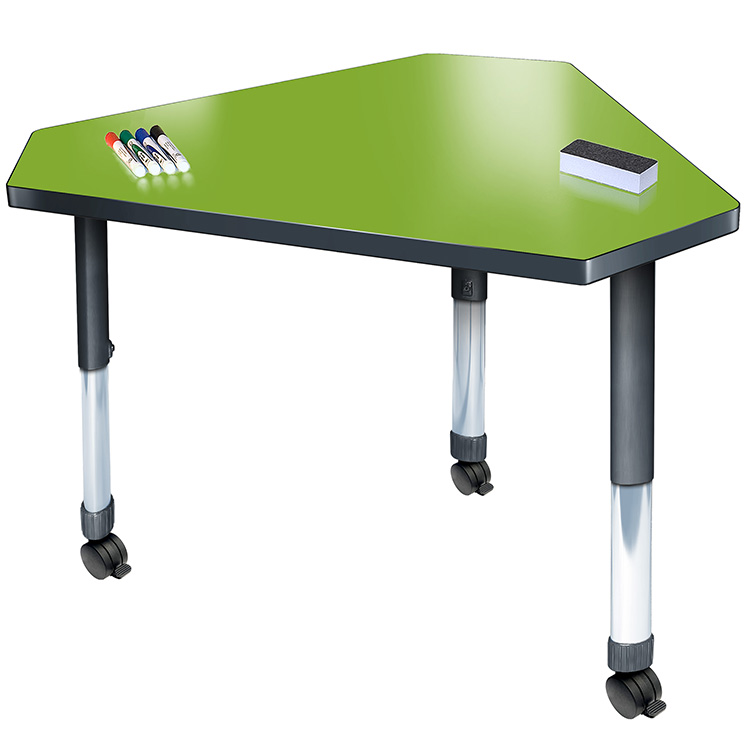 The Aero collection's contemporary aesthetic makes it easy to create a cohesively designed learning environment. Consisting of desks and tables, this collection offers adjustable nylon swivel glides or optional casters for added mobility. The work surface boasts high-pressure laminate (HPL), ensuring durability and functionality. The leg fastening system is engineered to provide a secure and wobble-free fit. With its unique shapes, Aero enables versatile configurations, making it an ideal choice for any classroom setting. To add a touch of personalization, the vinyl edge is available in a range of popular colors. Additionally, you can select leg colors from a sleek black or platinum option.
